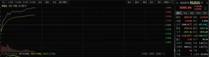 早盘 A 股刚开盘,特高压板块就给出了极强的赚钱效应。川润股份开盘 3 分钟从下跌直接拉上涨停,资金抢筹态度坚决;积成电子、汉缆股份紧随其后快速封板;通光线缆更是用 21 分钟封住 20CM 大号涨停。截至上午收盘,板块内涨停及涨幅超 10% 的个股接近 12 只,板块指数一度大涨 4%,电力相关 ETF 同步上涨。